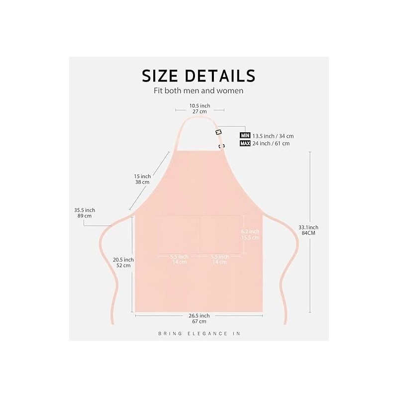 - We chose the dimensions of a 26.77×33.07 inches apron to better-fit men and women. The shoulder straps can be adjusted from a minimum of 13.5 inches to a maximum of 24 inches, allowing for adjust based on coverage needs. With 2 tie straps measuring 35.5 inches each, they adapt well to different body types and can be adjusted for preferred tightness.