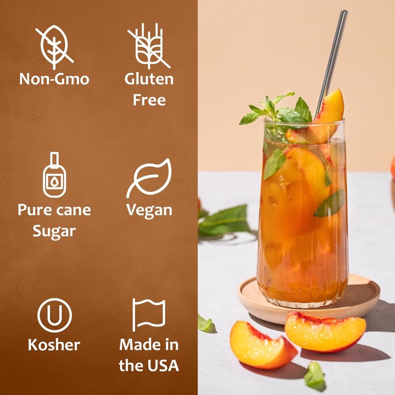 - Add a burst of ripe peach flavor to your favorite dishes and drinks with Syruvia Peach Syrup, a kosher and gluten-free syrup that makes cooking and mixing a breeze.