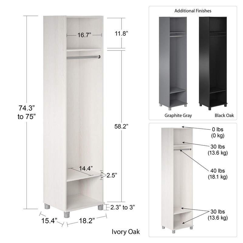 - 3 Shelves, 2 fixed, 1 adjustable for shoes, backpacks, purses, hats and other essentials each measuring 16.7" W x 14.4" D, and able to hold up to 30 lbs. each. Top and Lower shelf 11.8"H. Middle shelf 58.2"H