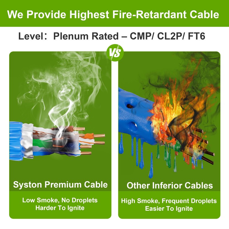 - CMP (Plenum-Rated): Our cable is designed with your safety in mind. It has the flame retardant grade of CMP/CL3P/FPLP (Plenum-Rated) and is the highest flame retardant cable. This cable suited to go in the plenum spaces of buildings such as ceilings and enclosures, that are also used by the building for air distribution systems to transport air. CMP is higher than commercial grade cable CMR and civil grade cable CM.
