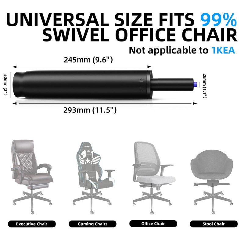 - 【Universal Size for Most Chairs】Our durable office chair cylinder replacement is designed for a universal fit, with a 2-inch outer cylinder diameter and 1.1-inch inner cylinder diameter that will fit most office chairs, including Herman Miller Aeron. *Confirm cylinder measurements before purchasing.
