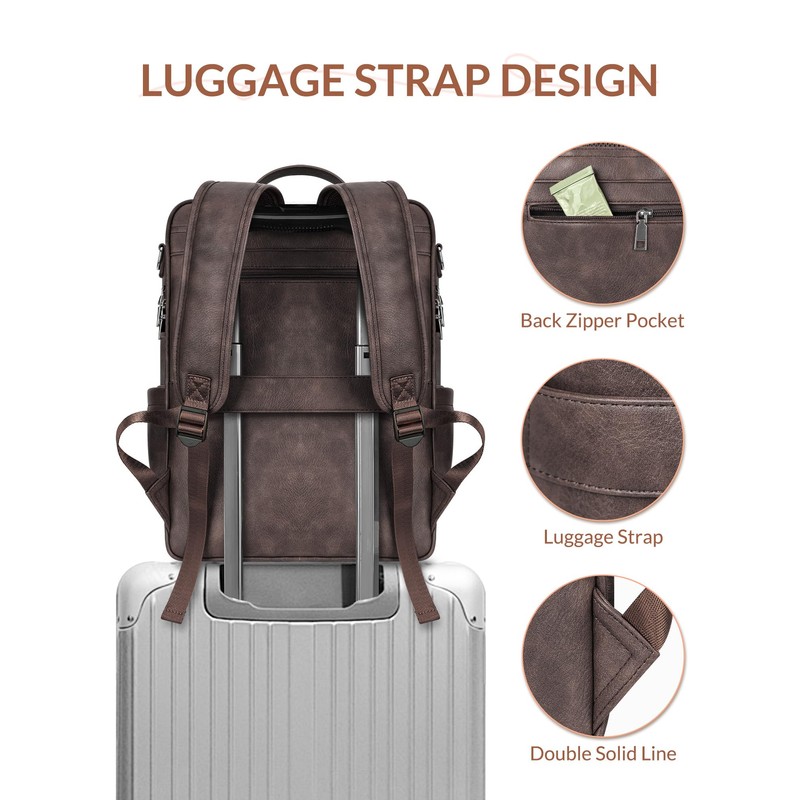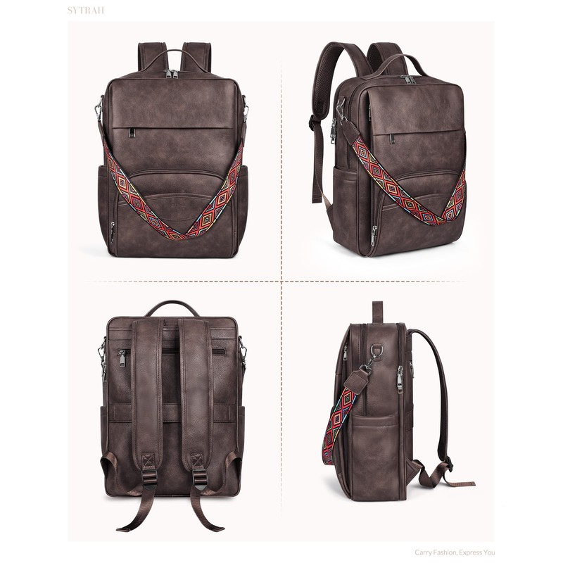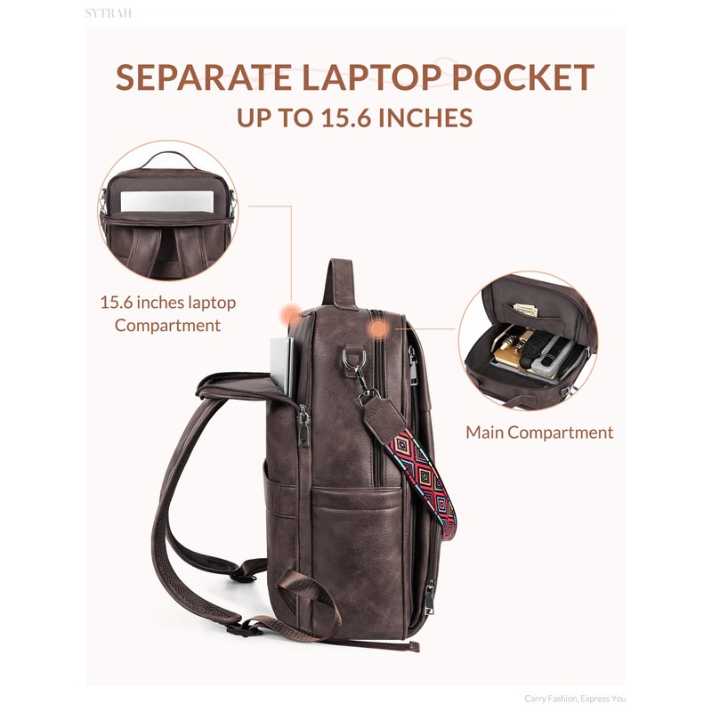 - [Sleek & Secure Laptop Backpack] - Measuring 15 x10.63 x6 inches (38 x 27 x 15cm). The SYTRAH 15.6 leather backpack for women is built for those who need serious storage without compromising style. Made from soft yet durable PU leather, this leather laptop bag features a fixed-length 24" colorful strap for a trendy shoulder bag look, plus a laptop bag with luggage sleeve for seamless travel.
