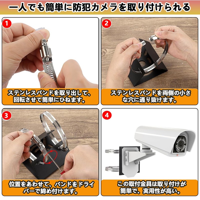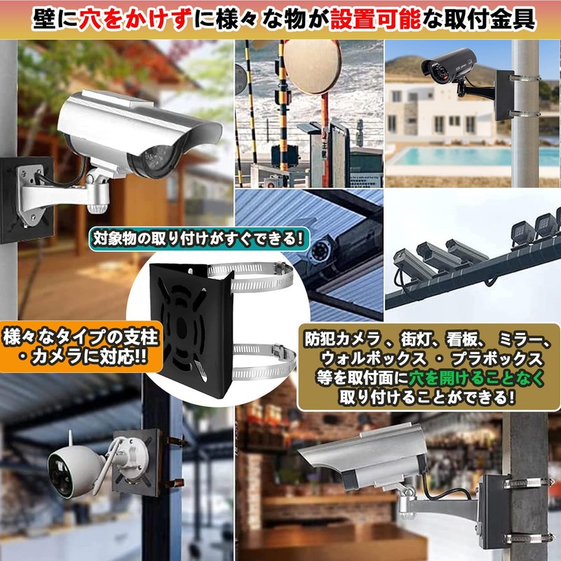 - Security camera bracket that can be installed in various locations such as outdoor and indoors: This security camera comes with a stainless steel band that allows you to securely secure the security camera to the posts such as cylinders and squares. Easy to install on poles, concrete columns, wood pillars, grids and wire mesh fences. Instead of drilling holes into the mounting surface, install security cameras, street lights, signs, mirrors, wall boxes, plastic boxes, etc