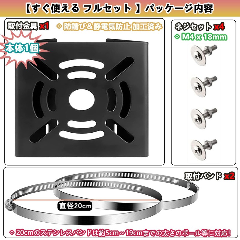 - Complete Set of Necessary Items: Set Includes: Security camera mounting hardware x 1, stainless steel band x 2 (size diameter: 7.9 inches (200 mm), length 24.8 inches (63 cm), M4 x 18 mm stainless steel screw set x 4). Bracket set for mounting security cameras when you want to install a security camera. Installation environment: Indoor/Outdoor This product is safe and secure to protect your home and family! Please confirm the size before purchasing
