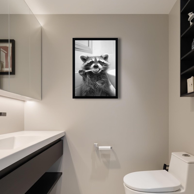 - Funny raccoon Art Wall Decor : Features a hilarious raccoon appearing to brush its teeth, bringing humor to any wall with its whimsical and eye-catching art that sparks smiles. The black and white design ensures timeless appeal,creating a serene focal point that complements bathroom themes from modern to spa-like retreats beautifully