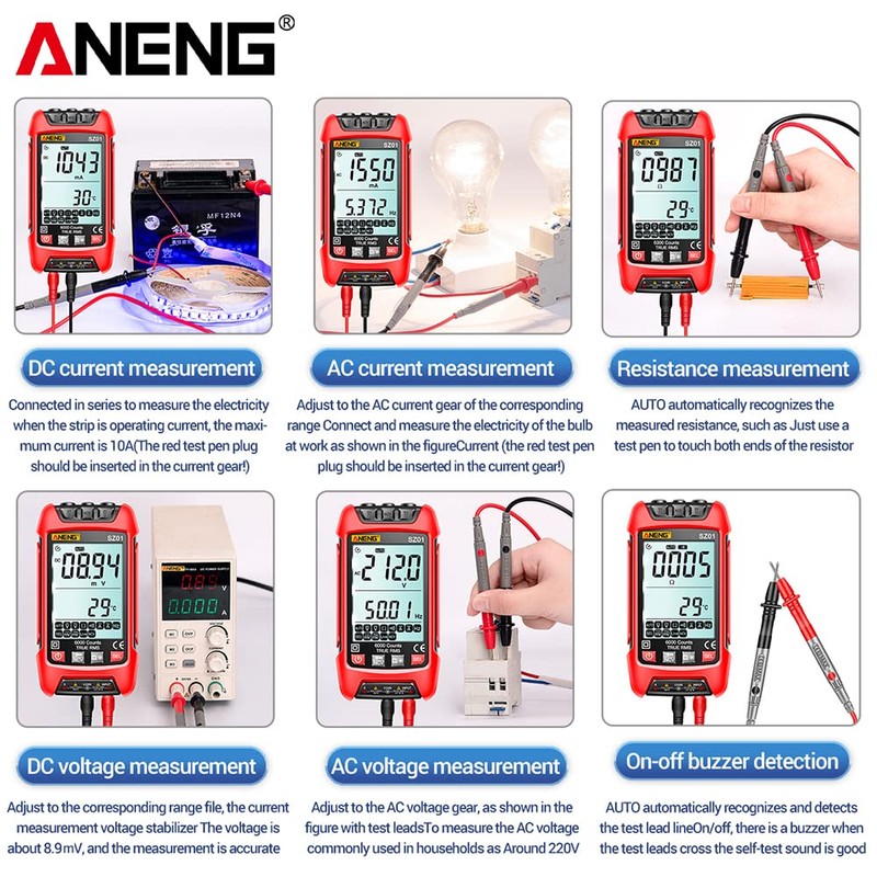 • Feature:1. Easy to use: This product is a battery-driven auto-ranging digital multimeter with true RMS.2. Digital display: The instrument is used for 6000 counts display, LCD display, backlight display, and clear reading.3. Strip lighting: The strip lights on both sides of the screen will change synchronously with the intensity of the electric field. With LED lights, it is not affected by light.4. Multimeter: You can use voltage, current, resistance, on-off, diode,