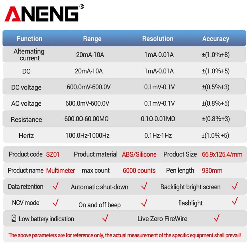 Specification:DIY Supplies: ELECTRICALDisplay Type: Digital displayOperating Temperature: NoneModel Number: Digital MultimeterIs Smart Device: NOModel: SZ01AC current: 600.0mA/10ADC current: 600.0mA/10ADC voltage: 600.0mV/6.000V/60.00V/600.0VAC voltage: 600.0mV/6.000V/60.00V/600.0VLine continuity test: 1Resistance: 600.0/6.000k/60.00k/600.0k/6.000M/60.00MNCV: YesFrequency: 100Hz/1000HzBacklight: YesPower supply: 2 X AAA batteries (not included)Shell material: ABSSize: About 127x67x29.2mm/5x2.64x1.15inColor: Red, Orange