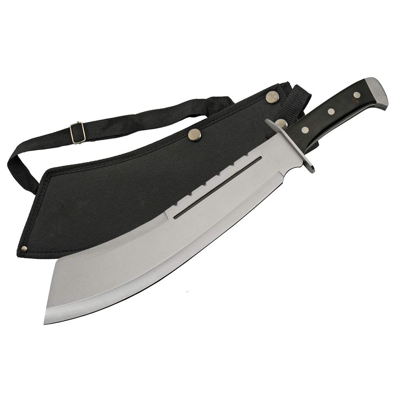 - Dependable: made with an all-black wooden handle fastened with steel pins, accompanied by a stainless-steel pommel and guard gives this large knife a comfortable and balanced grip.