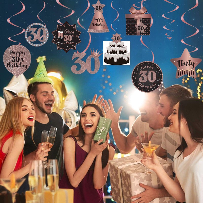• 30th Birthday Decoration Kit: Comes with total 10 different hanging swirls in the kit. The cutouts are double-sided design glitter rose gold color. The swirls are shiny metallic foil swirls. There are a variety of birthday element patterns including gift box, hat, cake and other popular patterns…