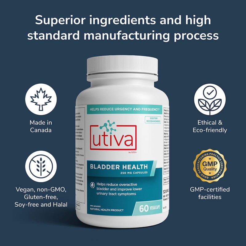 Szio+ Utiva Bladder Health – Natural Bladder Control Supplement for Overactive Bladder and Lower Urinary Tract Health – Clinically Proven to Reduce Frequency and Urgency - 60 Capsules - Made in Canada