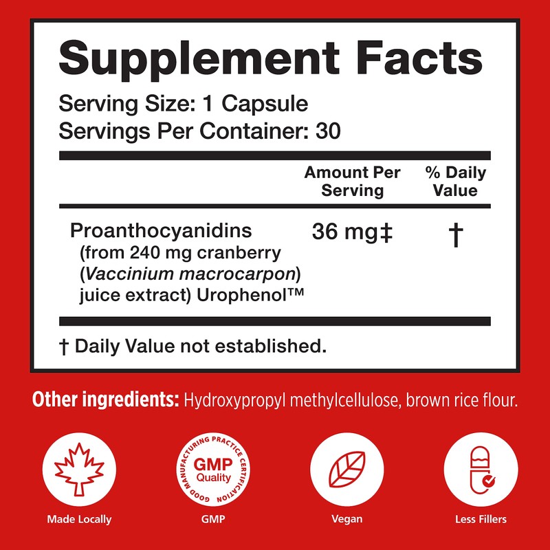 - SMALL ONE-A-DAY CAPSULES: The convenient daily cranberry capsules are small, easy to swallow one-a-day vegi capsules; they are made in Canada and are vegan, halal, non-GMO and free of gluten, soy, dairy, eggs, and nuts