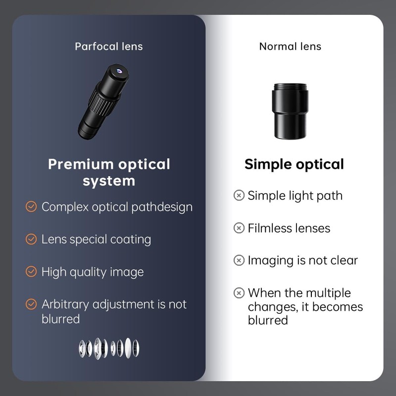 - Cinema-grade Parfocal Lens: The NF-318 microscope uses a parfocal lens, you will be able to focus on the subject and then zoom in to take the shot without having to refocus the lens, the digital microscope is still able to capture images at any distance without manual adjustment by the user , the parfocal lens saves your time and increases your productivity