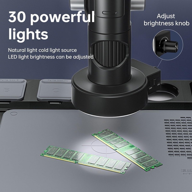 - 30 Adjustable LED Lights, 2.4G Wireless Remote Control: The 30 adjustable LED illuminators of the welding microscope emit light evenly, soft and not dazzling, and there will be no ghosting. This digital magnifier comes with a convenient wireless remote for easy operation from a distance