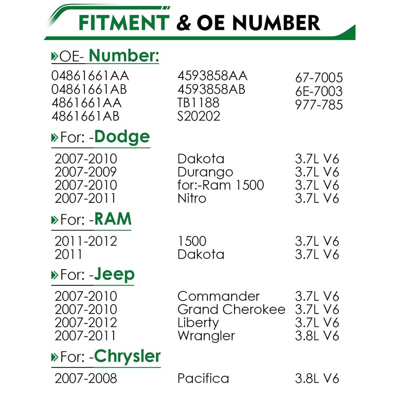 - Fitment: for:-Dodge Dakota 2007-2010 3.7L V6, Durango 2007-2009 3.7L V6, for:-Ram 1500 2007-2010 3.7L V6, Nitro 2007-2011 3.7L V6 & for:-RAM 1500 2011-2012 3.7L V6, Dakota 2011 3.7L V6
