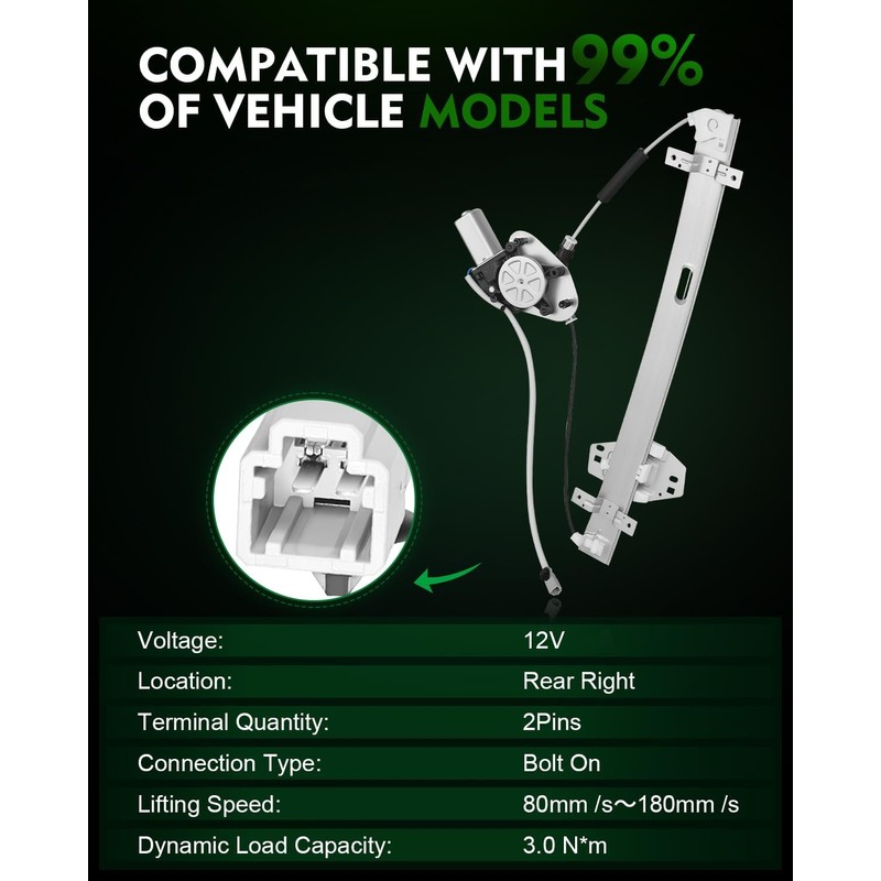• One-Touch Window Control: Slow-moving windows that jam halfway advanced regulators provide effortless, instant response with a single touch. Whether you're rushing through a drive-thru or caught in an unexpected downpour, our system guarantees lightning-fast operation when every second counts. No more frantic button mashing or manual pushing just smooth, reliable performance exactly when you need it