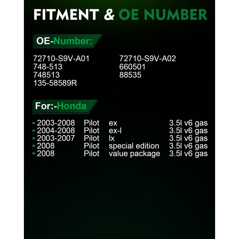 OE: 72710-S9V-A01, 748-513, 748513, 72710-S9V-A02, 660501, 88535, 135-58589R Fitment for:-Honda 2003-2008 Pilot Ex 4 door sport utility 3.5L V6 2004-2008 Pilot Ex-L 4 door sport utility 3.5L V6 2003-2007 Pilot Lx 4 door sport utility 3.5L V6 2008 Pilot Special Edition 4 door sport utility 3.5L V6 2008 Pilot Value Package 4 door sport utility 3.5L V6