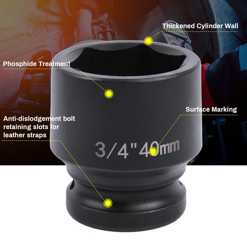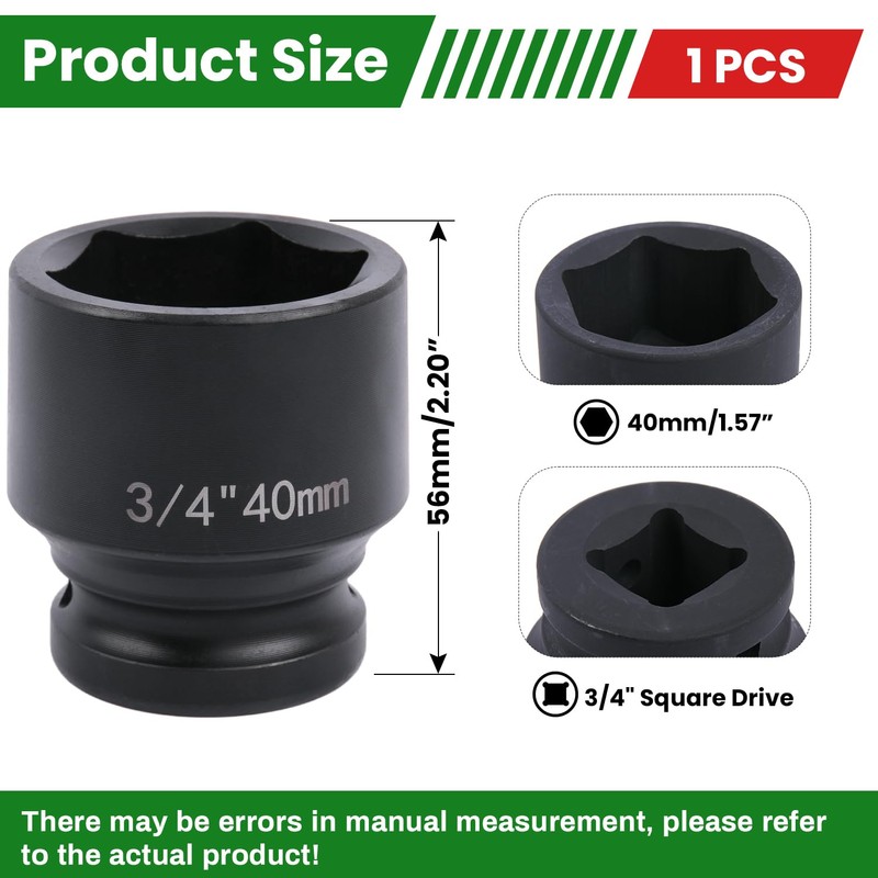 • 【SIZE - DRIVE】:3/4 inch, 6-point socket size:40mm, total length 56mm. The specifications are clearly marked on the surface of the socket, which is easy to identify and improves work efficiency.