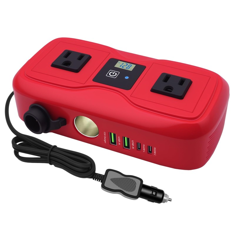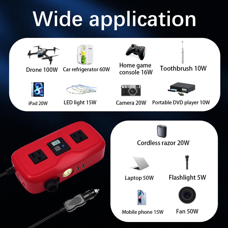 - Fast Charging Car Inverter:This inverter 12v to 110v is equipped with two USB fast charging ports, which can greatly save your charging time. The PD interface and QC fast charging interface can offer a charging time 3 to 4 times faster than that of the conventional USB interface. This power inverters for vehicles is equipped with 2X 20W PD fast charging ports and 2X 18W QC3.0 fast charging ports. It can charge most devices, such as mobile phones, tablets, laptops, dash cams, car refrigerators, drones, camp trailers, inflate air mattress for camping, battery chargers, power tool chargers, portable solar panels, fans, and so on.
