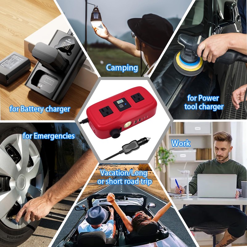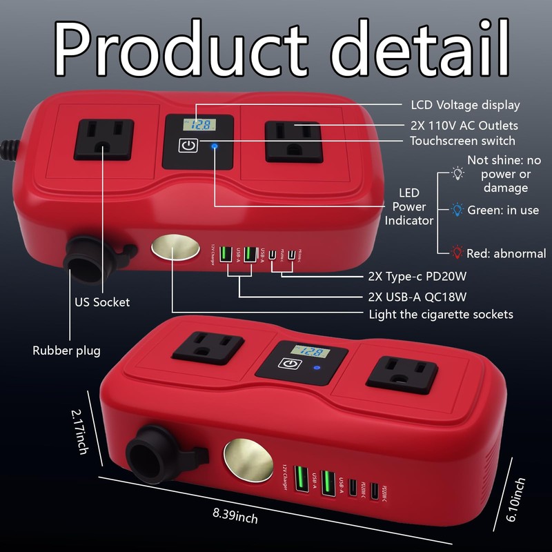 - Portable Power Inverter:This car plug in adapter outlet can provide you with convenient charging device connection, especially suitable for long and short road trips, camping, emergency , mobile office, remote work, and other uses. The size of the power inverter 12v to 110v is 8.396.102.17inch. It is portable and has a beautiful appearance. Power inverter 12v to 110v is an essential car accessory. The charging cable of the inverter is 25.59 inches long and can be used in the back seat of a car.