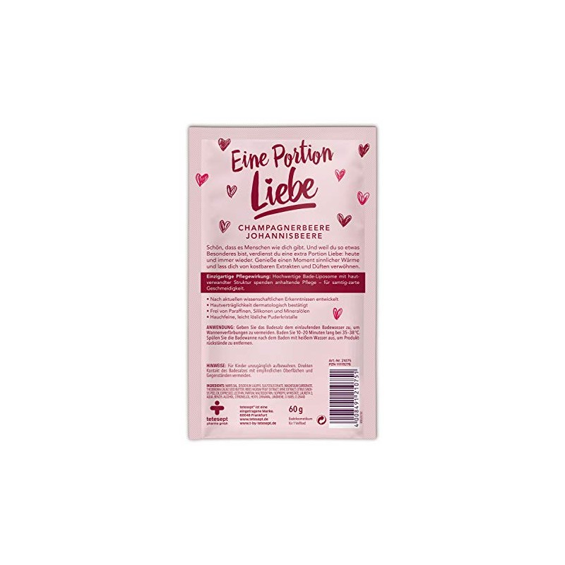 - Box contents: 1 x 60 g bath remedy "Eine Portion Liebe" by t: by tetesept / bath agent to give as a gift - without preservatives, alkali soap, paraffins, silicones and mineral oils