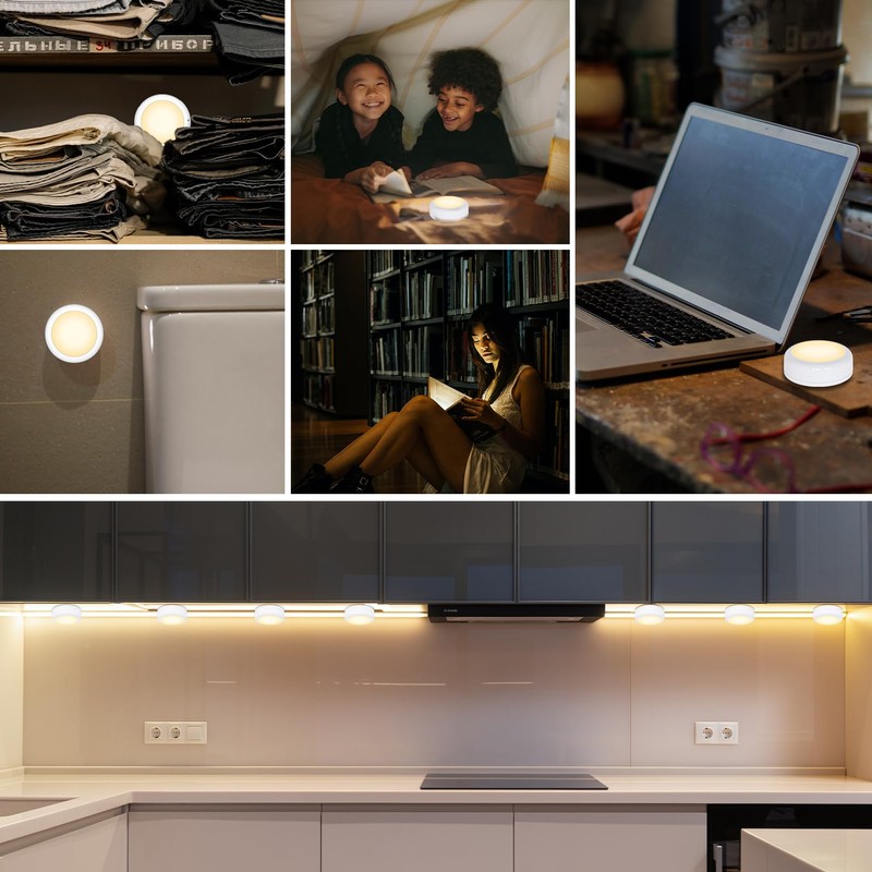 - HIGH BRIGHTNESS & THREE WHITE COLOR TEMPERATURE-- This puck lights battery operated can give out brightness of 60lumens, and dimmable with 10-level brightness adjustment(10% - 100%). This Push lights stick-on also features 3-color temperature of 3000 Kelvin warm white, 4500K neutral and 6000K nature cool white glow, greatly helping light up the dark areas around your house as functional lighting, or adding extra light and ambience to your counter, collections, figurines and more as mood lighting