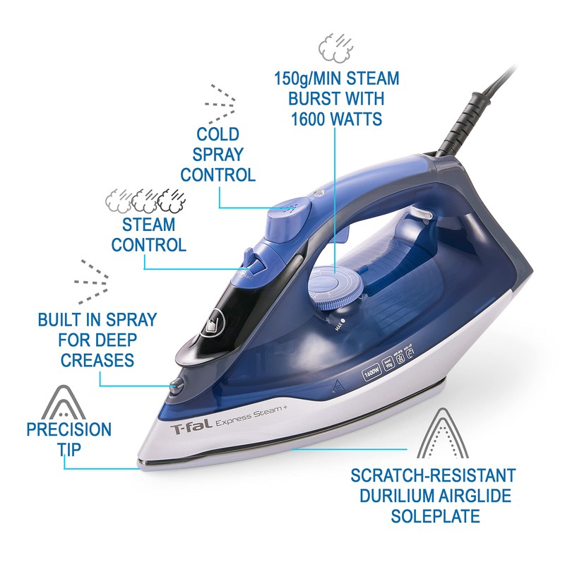 T-fal, Iron, Express Steam Iron for Clothes, Durilium Soleplate, Precision Tip, 30 Second Auto Shut Off, 1600 Watts, Anti-Drip, Ironing, Blue Clothes Iron, FV2886U0
