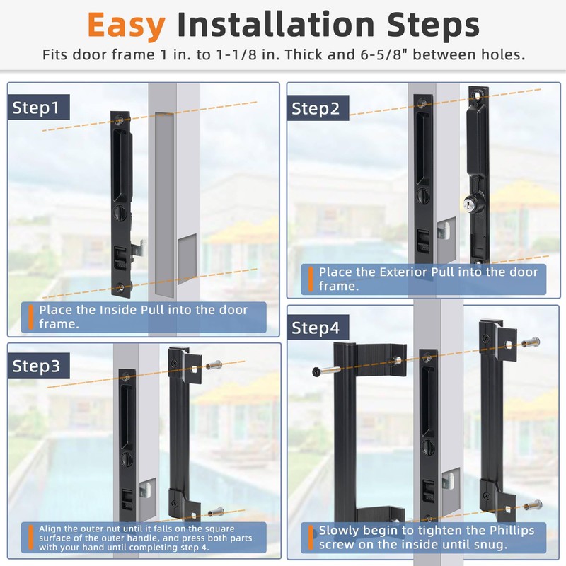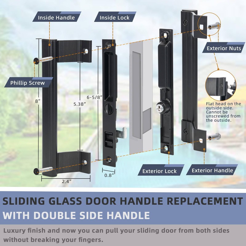 - 🔊EASY INSTALLATION: Standard reversible flush mount for left or right-handed sliding glass doors. This handle fits 6-5/8” hole spacing and only works with hook style door handles.