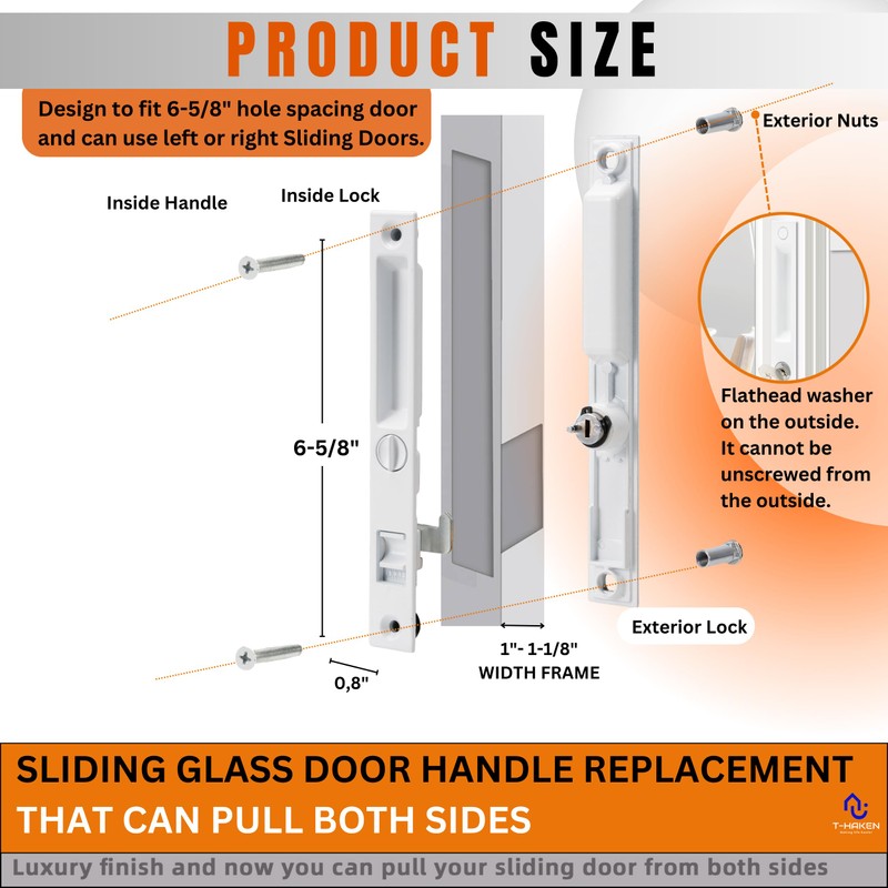 T-HAKEN Sliding Glass Door Handle Set | 6‑5/8″ Hole‑Center, Flush‑Mount Hook Style, Non‑Handed, Fits 1″–1 1/8″ Thick Doors – Keyed (White)