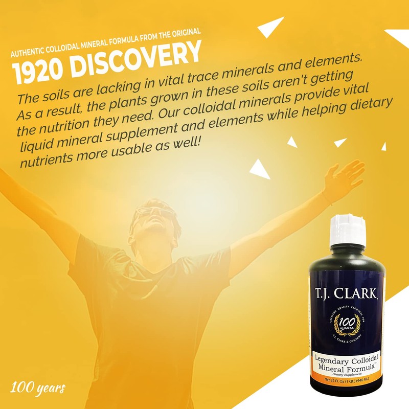 - TJ Clark's Legendary colloidal liquid vitamins mineral supplements contains up to 72 naturally occurring trace minerals and elements from prehistoric plant deposits.