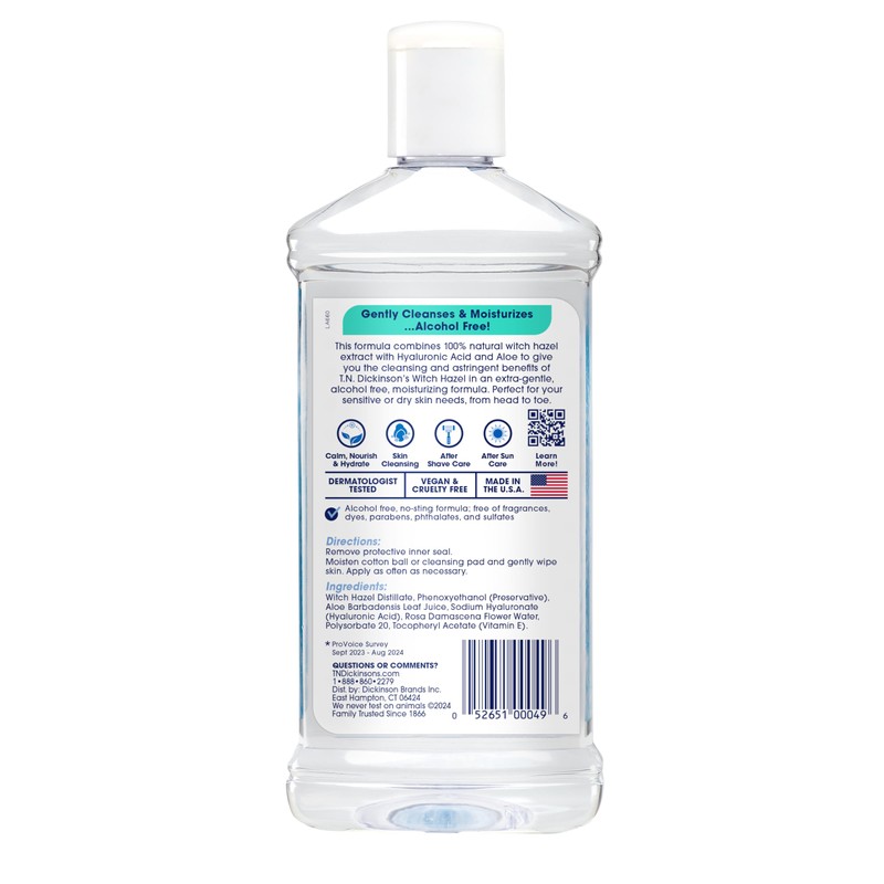 Astringents are great cleansers, but sometimes even the gentle ones don’t give me skin the moisture it needs. Introducing Alcohol-Free Moisturizing Astringent from T.N. Dickinson’s Witch Hazel, the #1 astringent brand. It has all the great astringent & cleansing benefits of T.N. Dickinson’s Witch Hazel, but in an extra-gentle, alcohol-free, moisturizing formula perfect for dry, sensitive irritated skin. Established in 1997, Dickinson brands brought together two heritage hallmarks of Dickinson's and t. N. Dickinson's, which have been providing effective skincare solutions for more than 150 years prior. At t. N. Dickinson's, we remain committed to providing you with the highest quality products, ones that leave your skin feeling healthy and hydrated (and without harsh or confusing ingredients). A pure clean for a pure, beautiful you: With the natural healing properties of witch hazel on your side, that is the genuine promise of Dickinson's.