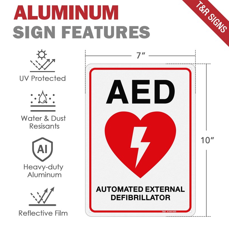 T&R AED Sign - 2 Pack - 10 x 7 Inches Rust Free .040 Aluminum -Reflective, UV Protected, Waterproof, Weatherproof and Fade Resistant - 4 Pre-drilled Holes