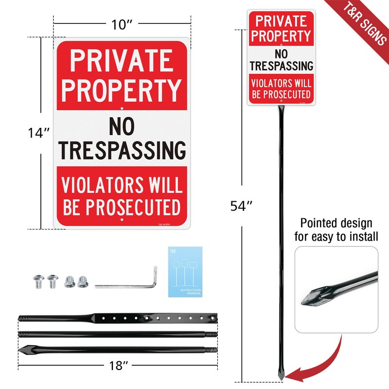 T&R Large Private Property No Trespassing Sign with 54" Stake, Violators Will Be Prosecuted - 14"x10" .040 Rust Free Aluminum, Reflective, Waterproof and Fade Resistant, 2 pre-drilled holes, Includes