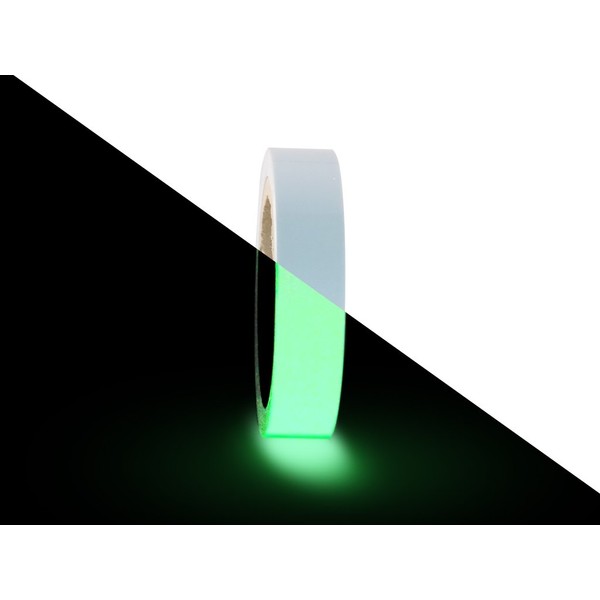 **Professional Glow in The Dark Tape** T.R.U. PGD-24 Glow in The Dark Tape is a flexible polyester laminated photoluminescent film coated with a permanent acrylic pressure-sensitive adhesive and backed with a 5 mil poly coated paper release liner. In sudden darkness, the tape is immediately visible. These tapes are a non-electric safety system that easily and inexpensively affixes to walls, handrails, columns, around doorframes, and along stairways and baseboards. Tape will glow in total darkness after exposure to artificial or natural light - it is fully charged within 30 minutes. Glows brightest the first 30 minutes after activation has ceased, but will remain clearly visible in a total dark room to the night adapted eye for 24+ hours. Adhesive has a 24-hour dwell time. The tape has a white/cream color in its uncharged state and when glowing the tape has a luminescent lime green color. **Absorbs and stores energy from** Normal ambient light - UV light - Artificial light **Properties** \- Adhesive: Solvent-based acrylic \- Carrier/Backing: Laminated photoluminescent polyester film \- Thickness: 15 mils (carrier + adhesive) \- Adhesion: 72 oz/in (to stainless steel test panel) \- Tensile: 30 lb/in \- Elongation: 200% \- Minimum application temperature: 50 F \- DIN 67510 Xe Lamp; 1000 Lx/5min: (time span necessary for afterglow brightness to diminish to 0.32 mcd/ m2 - 100X human eye perception) \- Release Liner: Poly coated paper \- 3" neutral core/carton **Note:** Sizes will be the tape industry standard metric sizes, ex. 12mm for every 1/2-inch of nominal value tape width (Rolls are give or take 5% wider or narrower than the nominal size)