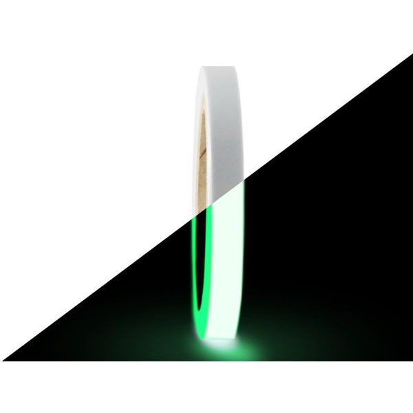 **Glow in The Dark Tape** T.R.U. PGD-6 Glow in The Dark Tape is a flexible polyester laminated photoluminescent film coated with a permanent acrylic pressure-sensitive adhesive and backed with a 5 mil poly coated paper release liner. In sudden darkness, the tape is immediately visible. These tapes are a non-electric safety system that easily and inexpensively affixes to walls, handrails, columns, around doorframes, and along stairways and baseboards. Tape will glow in total darkness after exposure to artificial or natural light - it is fully charged within 30 minutes. Glows brightest the first 30 minutes after activation has ceased, but will remain clearly visible in a total dark room to the night adapted eye for 6+ hours. Adhesive has a 24-hour dwell time. The tape has a white/cream color in its uncharged state and when glowing the tape has a luminescent lime green color. **Absorbs and stores energy from** Normal ambient light - UV light - Artificial light **Properties** \- Adhesive: Solvent-based acrylic \- Carrier/Backing: Laminated photoluminescent polyester film \- Thickness: 15 mils (carrier + adhesive) \- Adhesion: 72 oz/in (to stainless steel test panel) \- Tensile: 30 lb/in \- Elongation: 200% \- Minimum application temperature: 50 F \- DIN 67510 Xe Lamp; 1000 Lx/5min: (time span necessary for afterglow brightness to diminish to 0.32 mcd/ m2 - 100X human eye perception) \- Release Liner: Poly coated paper \- 3" neutral core/carton **Note:** Sizes will be the tape industry standard metric sizes, ex. 12mm for every 1/2-inch of nominal value tape width (Rolls are give or take 5% wider or narrower than the nominal size)