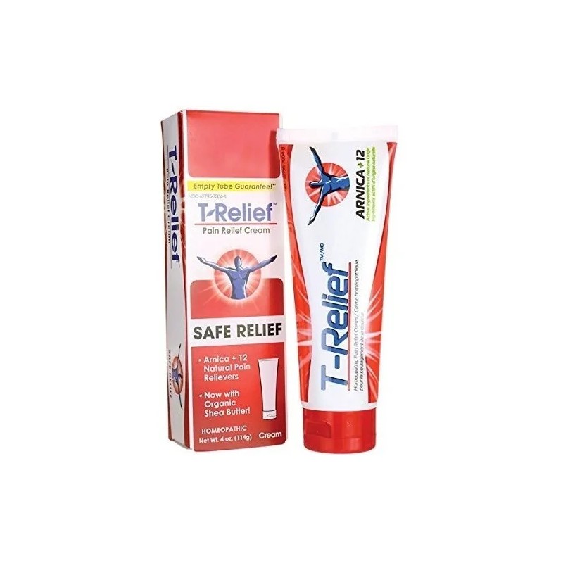 La Crema para el Alivio del Dolor T-Relief (114g) es un medicamento homeopático tópico con árnica, caléndula y otros ingredientes naturales para aliviar el dolor muscular, articular, de espalda y lesiones como esguinces y moretones. Se aplica externamente 3 veces al día o según necesidad. Es no grasa, sin olor y segura para uso frecuente. No usar en heridas abiertas y consulta a un médico si el dolor persiste o para uso en embarazo/lactancia.