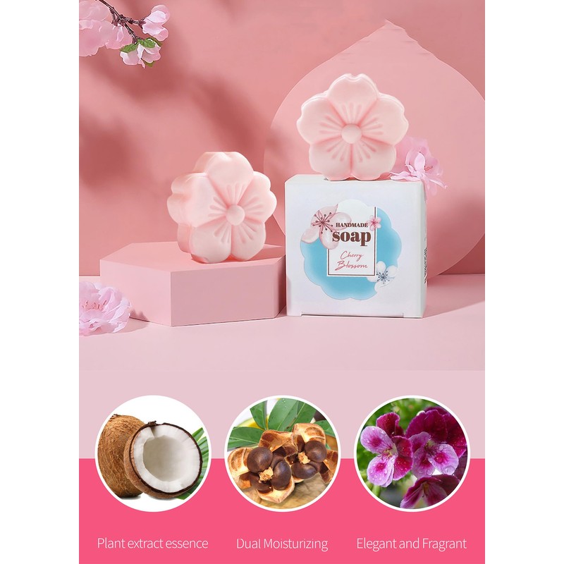 1Name:Sakura-Shaped Scented Botanical Soap;2Color:Pink;3Application:baths and skincare;4Fragrance:Floral;5Net Weight:45G;Package Weight:100G;6Soap size: 6 x 3.6 x 3.5 cm /2.4 x 1.4 x 1.4 inch; Package size: 9 x 9 x 4 cm /3.6 x 3.6 x 1.6 inch;7Package: 2 Pack Sakura-Shaped Scented Botanical Soap with blistering net in a gift package.Ingredients:Sorbitol solution,sucrose,stearic acid,glycerin, lauryl alcohol,cherry blossom extract,aloe vera extract,hyaluronic acid,Camellia seed oil;Method of use;Wet your skin and lather it with a foam net.Gently massage the foam into the skin for 2-3 minutes and rinse with water.ARTISANALLY HANDMADE:Each of our soaps is handmade by our very own soap artisan.This Soap moisturizing bars thoroughly cleanses,gently exfoliates,soothes itching,eliminates flaking and moisturizes fragile,damaged,dry skin.Free of artificial fragrances and artificial colorants,SLES free. Skin-friendly and non-irritating,mild formula.Suitable for all skin types.Note:Keep this product in a cool, dry and ventilated place, away from direct sunlight or immersed in water.This product is for external use only, it is recommended to stop using if discomfort occurs.This product is for foreign use, do not swallow, please keep out of reach of children.