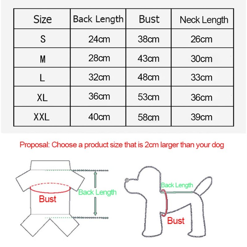 - Size S: chest: 36-40 cm; back length: 25-27 cm; neck circumference: 27-29 cm; size M: chest: 42-46 cm; back length: 30-32 cm; neck circumference: 30-32 cm; size L: chest: 48-52 cm; back length: 33-35 cm; neck circumference: 35-37 cm; size XL: chest: 52-56 cm; back length: 36-38 cm; neck circumference: 38-4 0 cm; Size XXL: chest: 57-60 cm; back length: 40-42 cm; neck circumference: 42-44 cm