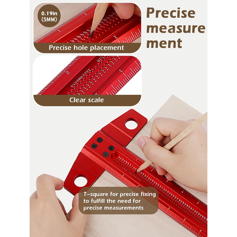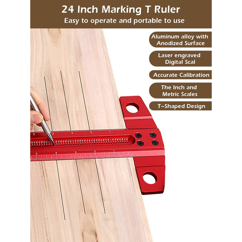 T-Square Woodworking Ruler - 24 Inch Architect Precision Marking Ruler, Aluminum Alloy Speed Square & Woodworking Scriber, for Carpenter Crafting, Marking, Layout, Scribing and Measuring, Red