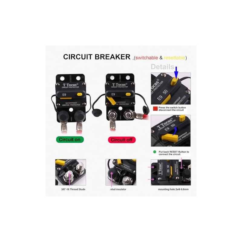 T Tocas T Tocas 50A Amp Circuit Breaker with Manual Reset - 3/8" Stud IP67 Waterproof (12V-72V DC) for Marine Trolling Motors, Boats, ATV/UTV - Heavy Duty Overcurrent Protection UL Certified