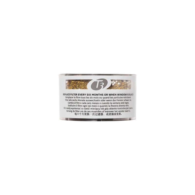 T3 Source Showerhead Replacement Water Filter. Compatible with the T3 Source Showerhead. Start your beauty routine with a clean slate. Our shower filters reduce free chlorine, which can cause frizzy, lackluster hair. They also remove dirt, odors and other impurities from your shower water. It’s pure alchemy. Features and Accessories: Mineral mixture (calcium sulfide, zinc, and copper) helps reduce free chlorine, and remove hydrogen sulfide, iron oxide, dirt, sediment, and odors. Reverse filter monthly for best results. Replace filter every 6 months (10K gallons) or when the filter window turns black. For use with T3 Source Showerhead Model No. 73302 or 73311 (sold separately) *This system has not been evaluated for free available chlorine reduction performance in the presence of chloramines. Free available chlorine reduction performance may be impacted by the presence of chloramines in the water supply. Please contact your local water utility to determine if chloramines are used in treating your water.
