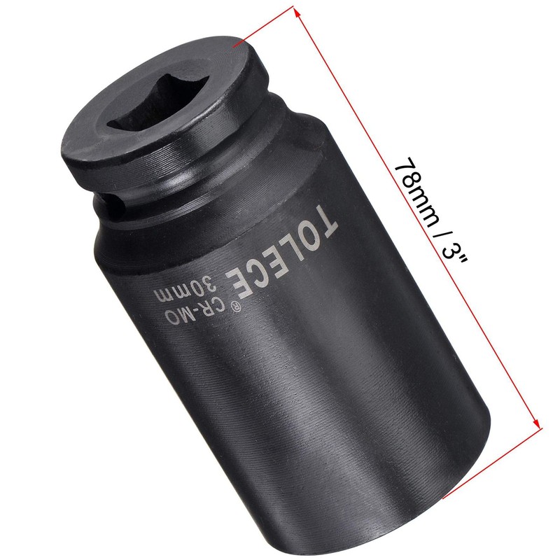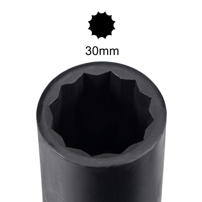 - Size and package: size: drive: 1/2 inch; 12-point socket wrench size: 30 mm; total length: 78 mm. Package Content:1 x 12 Point Socket Size Note The specifications are clearly marked on the surface of the socket, make sure the selected socket matches the specifications of the screw or nut, and applies the force evenly to avoid damage to the tool due to size mismatch or excessive force.