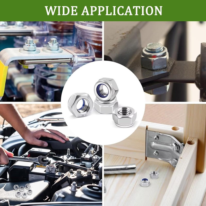 - 【Nylon Insert Design】: The nylon insert design can increase the friction between nylon and threads, prevent loosening caused by vibration, fix it more firmly, and prevent the nut from loosening under the action of vibration and torque.