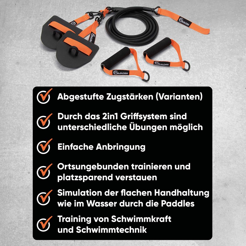 - Modular 2-in-1 set of paddles and handles. We also faced the problem that our existing pull rope was not created for all training exercises. Either the swimming grip options of paddles were missing or the normal loops to train even simple basic exercises that are impossible with the paddles alone. The TAALOGA 2-in-1 system solves exactly this problem. Switches from paddles to grips with just one click depending on the exercise and expands your training spectrum.