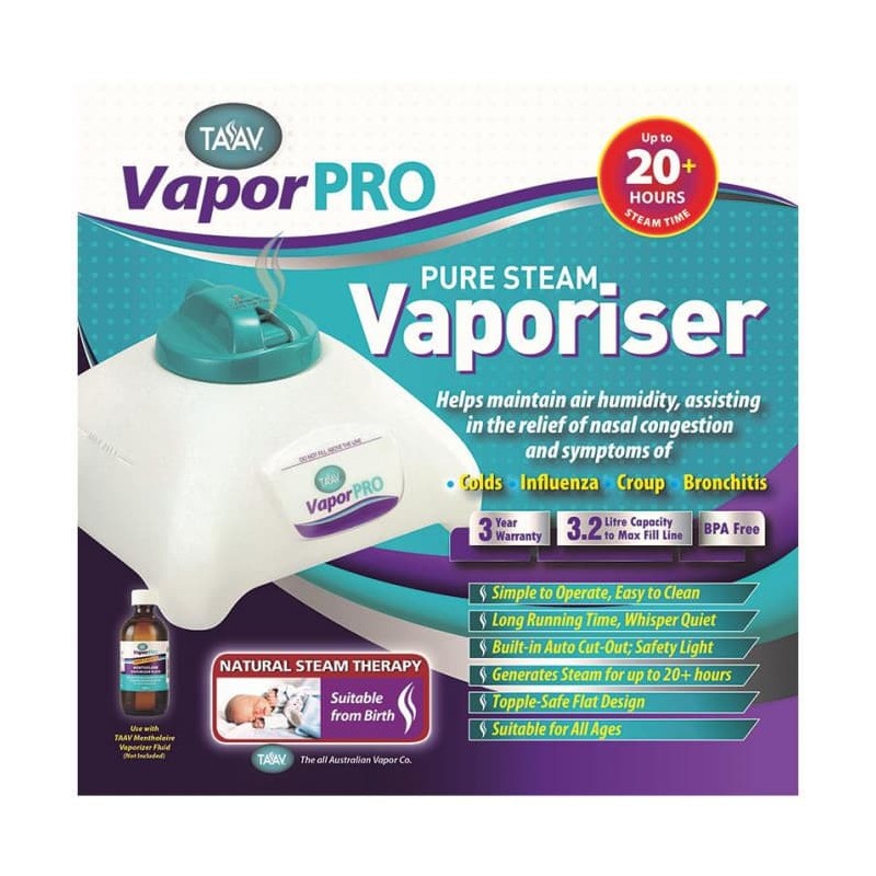 Pure steam Vaporiser by Taav Vapor PRO, helps in relieving nasal congestion and symptoms associated with croup, cold, bronchitis and influenza. This steam from this device, acts lubricant to restrict irritation and break up congestion in the head, lungs & bronchial tubes