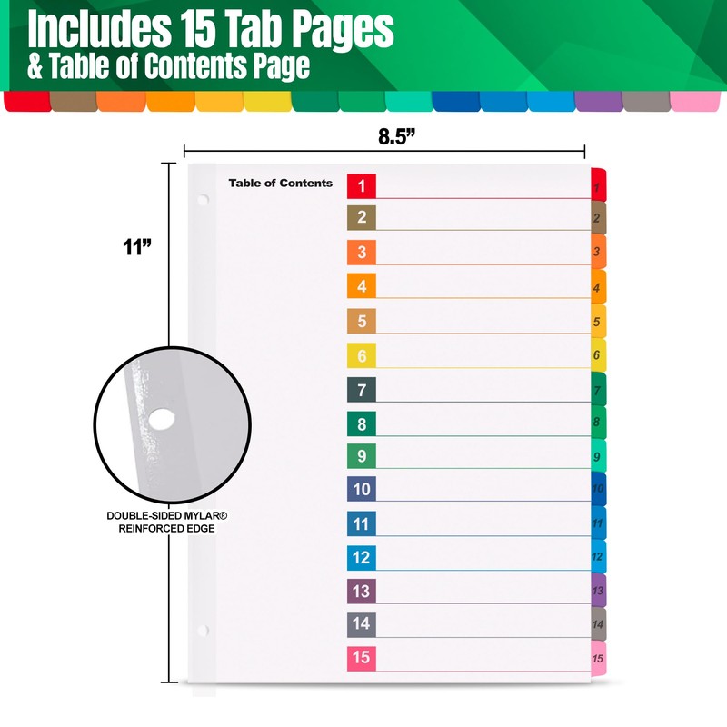 - Numerical index tabs 1–15 – Each set includes 15 clear, legible tabs numbered 1 through 15 for fast reference and section organization.