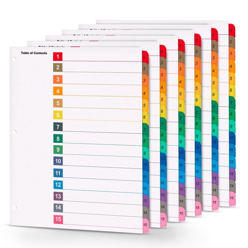 Tab Dividers for 3 Ring Binders – 6 Sets, 1–15 Numbered Index Dividers with Table of Contents – 8.5 x 11 in, 3-Hole Punched – Binder Dividers for School, Office, Filing, Organizing - 6 Pack