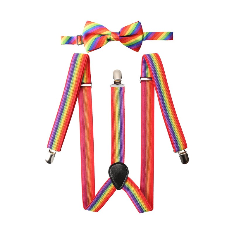 - Celebration Accessory: This adjustable rainbow brace and bow tie is the ideal accessory for a celebration of love, equality and diversity. Show your support for the LGBTQIA2s+ community by wearing the colors of the rainbow.