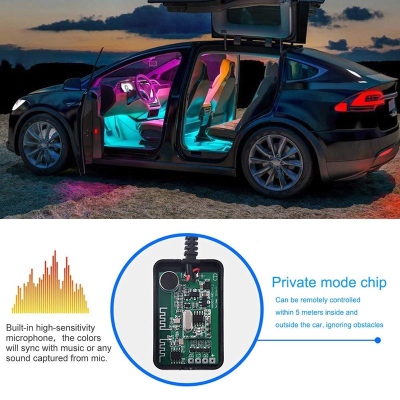 - ➤ 16 million colours: with 4 pieces of 5050 RGB car strips, infinite DIY colours among over 16 million colours and different shades/models to choose from. You can customize your own unique colour modes to add atmosphere to your interior while driving.