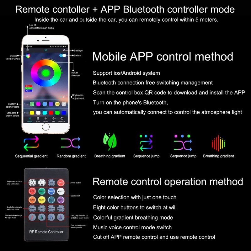- Bluetooth app control + RGB remote control: with the Bluetooth connection, you can play with 16 million colours and set the mode for multiple scenes via the app "Lotus Lantern". Other functions such as flashing, timer setting and music sync are available for you. Universal equipment for any car model, 12V output voltage, three methods for power connections: internal DC line, cigarette lighter and USB cable, easy to use.