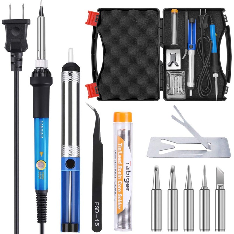 1.Tabiger welding soldering iron kit comes with adjustable soldering iron, solder wire, 5 interchangeable soldering heads, desoldering pump, anti-static tweezers, Y stand, and sponge.